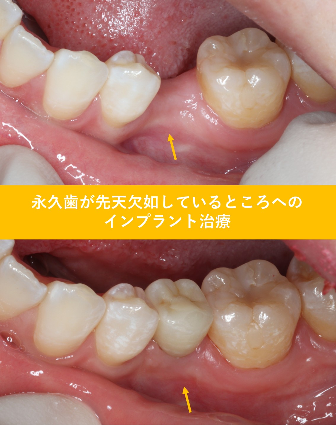 症例紹介 左下に永久歯が先天的にない部分へのインプラント治療を希望されて来院された患者様 左下に永久歯が生まれつき1本少なく乳歯が残っていたところが抜歯となり、インプラント治療を希望されて遠方から当院に紹介来院されました。永久歯の先天欠如は珍しいことではなく、特に第二小臼歯(前から5番目の歯)に多くみられます。前後の歯も含めて虫歯もなく、このような状態を回復 …