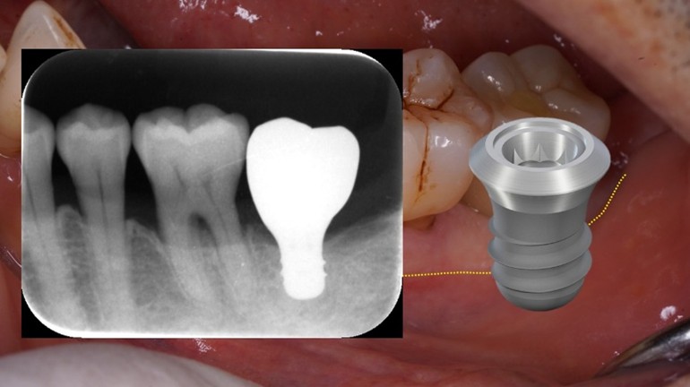 歯周病で歯を失った部分はすでに大きく骨がやせています。当院では骨造成などの処置も行っていますが、大掛かりな手術になるほどどうしても術後の腫れや痛み、長い治療期間が避けられなくなります。今回は6㎜という短い長さのインプラントで対応することにしました。